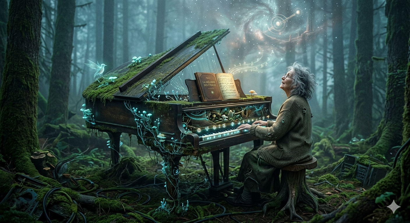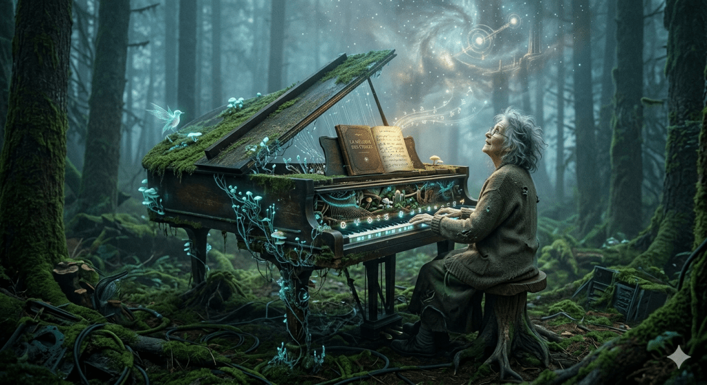 Là, en plein cœur de la forêt, les doigts agiles d’une vieille dame en haillon parcouraient avec ferveur les notes usées d’un antique piano à queue, recouvert de mousse verte et de champignons. S’échappant du couvercle, une magnifique mélodie mêlaient indistinctement ondes sonores et lumineuses en s’élevant vers le sommet des grands arbres.