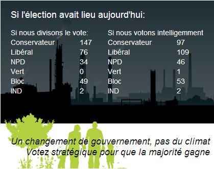 Si vouz croyez à la cause environnementale, il n’est pas trop tard. Ne vous laissez pas berner par les sondages. Si ensemble, nous votons stratégiquement, les destinées de ce pays seront à l’image de ce que l’on souhaite fondamentalement. Ne nous laissons pas manipuler par les politiciens, prenons notre avenir en main et dictons nos conditions au Gouvernement.