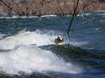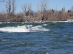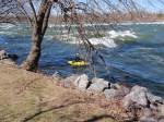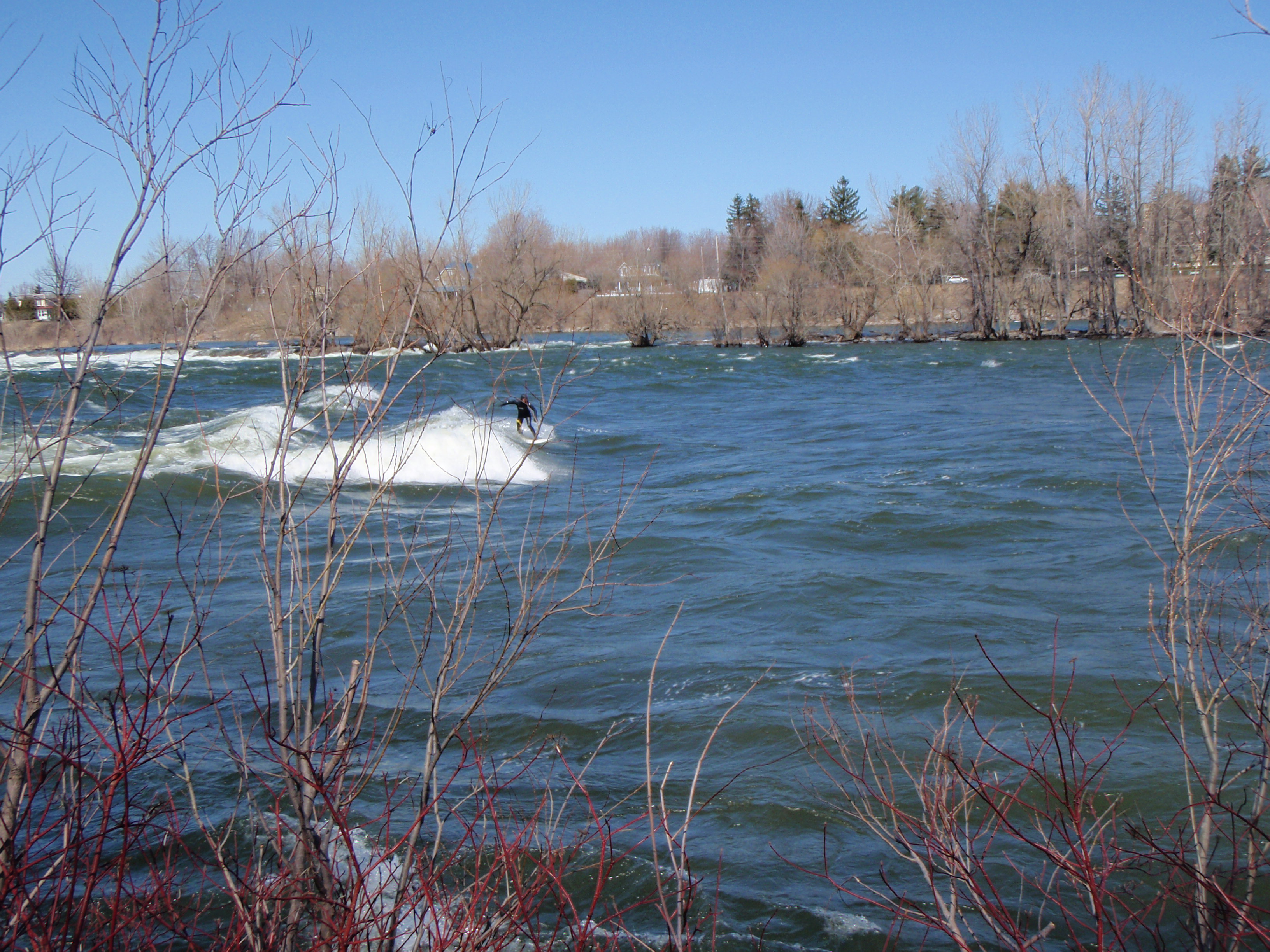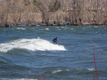 À chaque année, près de chez moi à Chambly, a lieu le festival de la grenouille en fête. Tout ceux qui le désirent peuvent s’inscrire à des activités de descente des rapides, ayant pour tout équipement, une combinaison d’homme-grenouille, masque, palmes et tuba. C’est tout de même une activité assez périlleuse, parce que le courant de la rivière Richelieu est assez fort à cette période de l’année. À plusieurs reprises, je me suis dit que je participerais à l’événement pour finalement me trouver toutes sortes d’excellentes raisons de changer d’idée à la dernière minute. Je vous parle de cela, parce que le weekend dernier, j’ai pris une marche et j’ai vu quelques amateurs de mini-kayak et même des surfeurs de rivière braver les vagues et le courant. J’ai pris quelques photos pour vous donner une idée de ce que ça pourrait être de se lancer dans ce courant et se laisser porter par les vagues.