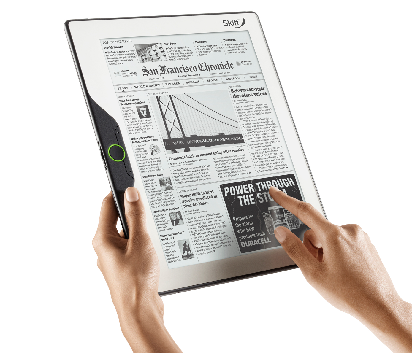 Je vise maintenant le prochain produit, qui sera disponible au printemps à un coût indéterminé. C’est le Skiff. Un livre électronique, ultramince, léger, comportant les avantages du eReader, mais ayant cette fois un format 8 1/2 x 11, donc plus adapté à la lecture de documentation technique et, pourquoi pas, les journaux en ligne. (Cliquez sur les images pour les voir en plus haute résolution).
