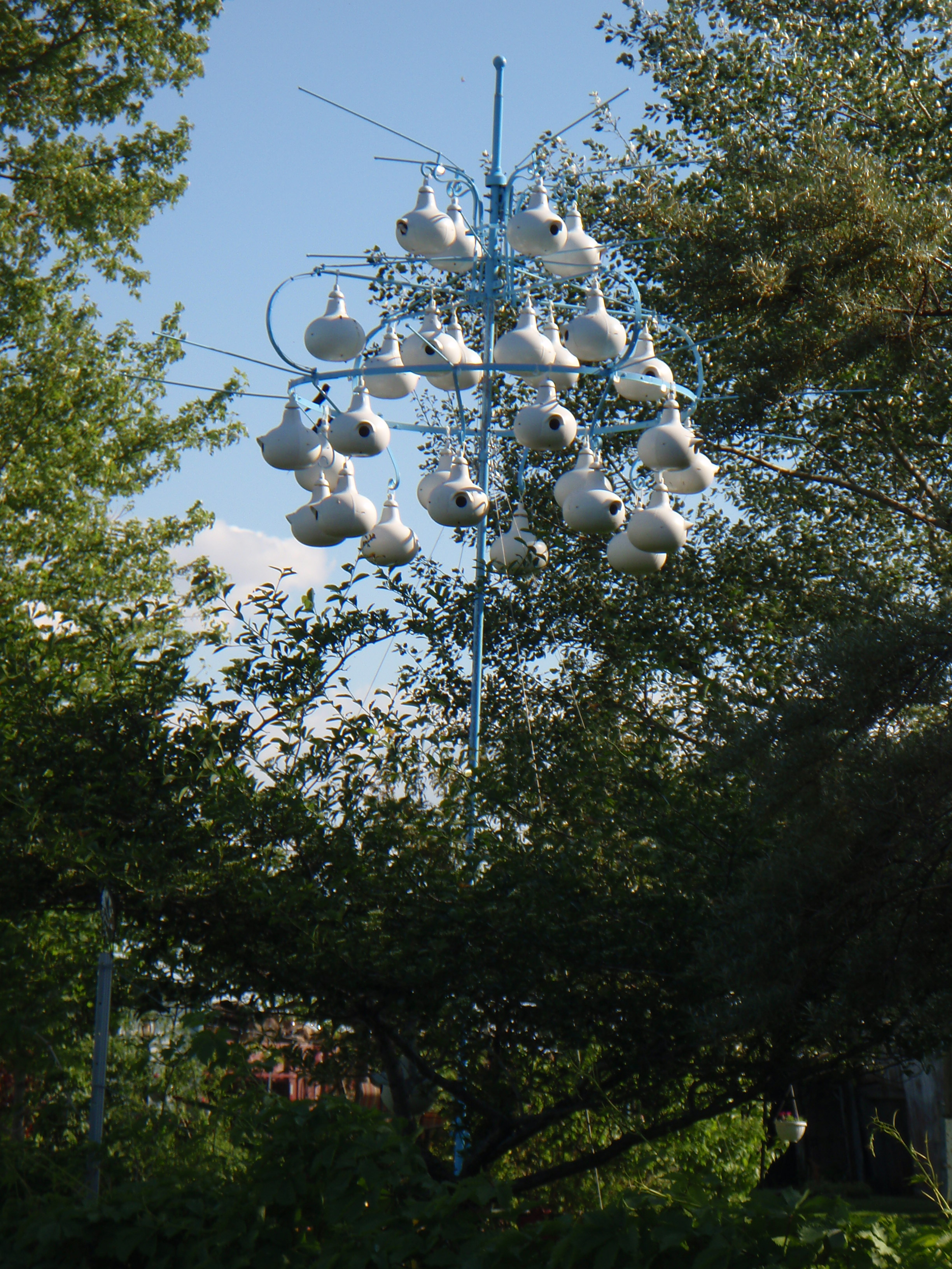 À chaque printemps, quand les lilas sont en fleur, j’ai le plaisir d’assister à un spectacle étonnant. Pas très loin de chez moi, à la limite de Chambly & Carignan, le long du canal,un homme a forgé et planté chez lui un arbre de vie. Alors que tout autour les végétaux sont en feuille, cet arbre un peu étrange est plutôt orné d’énormes bourgeons blanc au sein desquels poussent des bébés hirondelle. je salue donc aujourd’hui le talent et la générosité de cet artiste, grâce à qui de nombreux couples d’hirondelle, chaque année, prennent place dans ces condos sur mesure, pour y élever leurs familles d’oisillons et devenir ainsi de nouveaux résidents de cette magnifique région.