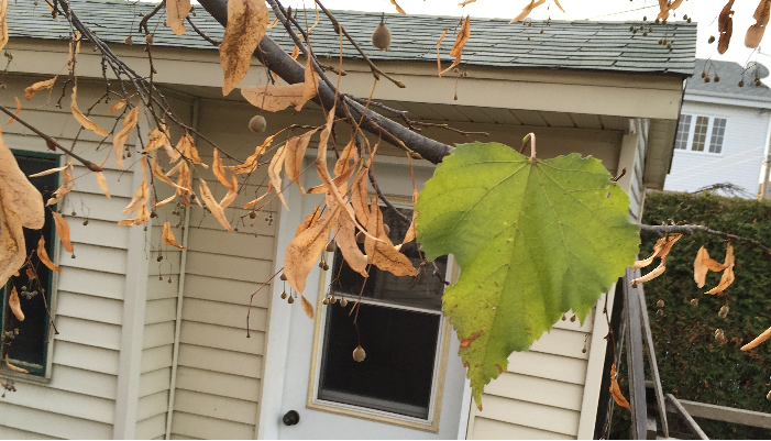 Et là, j’ai remarqué cette feuille de notre tilleul, encore toute verte malgré l’automne avancé. Elle m’a rappelé ces qualités de persévérance, de résilience qui me tiennent tant à coeur. Peu importe que les autres autour d’elle aient cessé de combattre devant l’inéluctable destin, elle continue d’y croire.