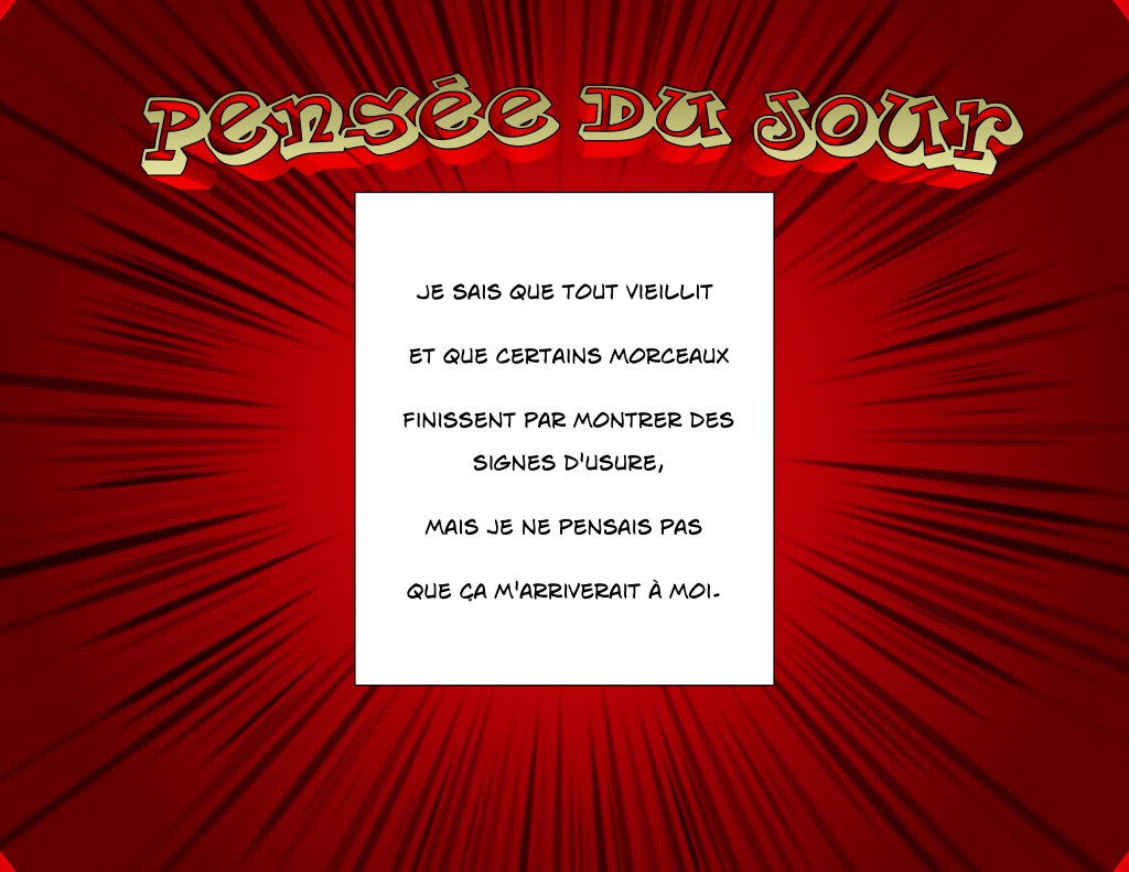 Oui, Marie, en effet. J’ai un genou qui me cause certain soucis depuis quelques semaines ce qui me force à changer mes plans. Nous prévoyons amener deux de mes petits-fils faire de l’escalade intérieure cette semaine, mais je me contenterai de les accompagner plutôt que de grimper avec eux. 🙂