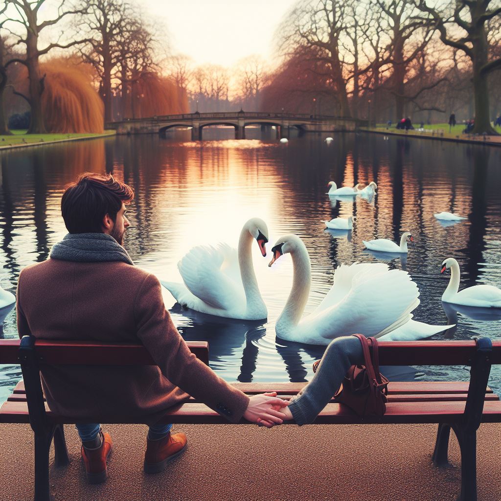 Ce qui est amusant, avec « Bing Image Creator », c’est de voir les incohérences qui sont parfois générées. Ici, par exemple, la phrase était « un couple d’amoureux, assis sur un banc de parc, qui se tiennent la main devant un couple de cygnes qui s’aiment ». Cette image, visiblement incohérente est aussi un peu perturbante et stimule également l’imagination. Elle me fait notamment penser à ces couples qui vivent ensemble, se côtoient, mais qui deviennent invisibles l’un à l’autre.