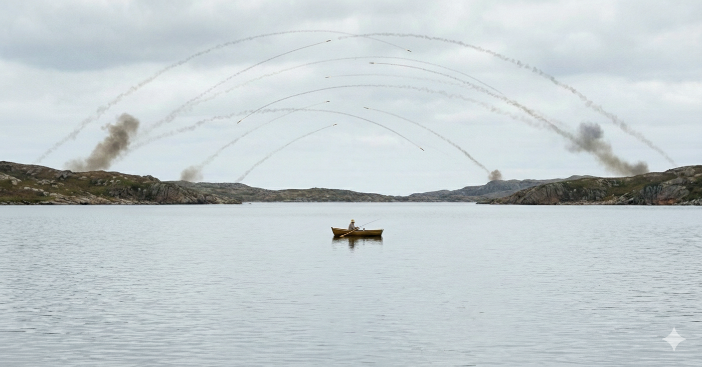 À gauche, une colline s’embrase sous les cris des belligérants. À droite, une autre répond, vomissant des éclats de feu qui se reflètent sur l’eau comme des soleils brisés. Les bombes montent, retombent, éclatent et pourtant, le lac demeure un miroir, seulement frémissant, comme si la guerre n’était qu’un orage lointain. Le pêcheur, lui, respire lentement. Chaque souffle efface un peu du tumulte. Ses mains, tannées par le vent, tiennent sa perche avec la douceur d’un vieux rituel. Il attend le frémissement d’une prise, un signe minuscule, presque sacré, que la vie continue malgré les hommes.